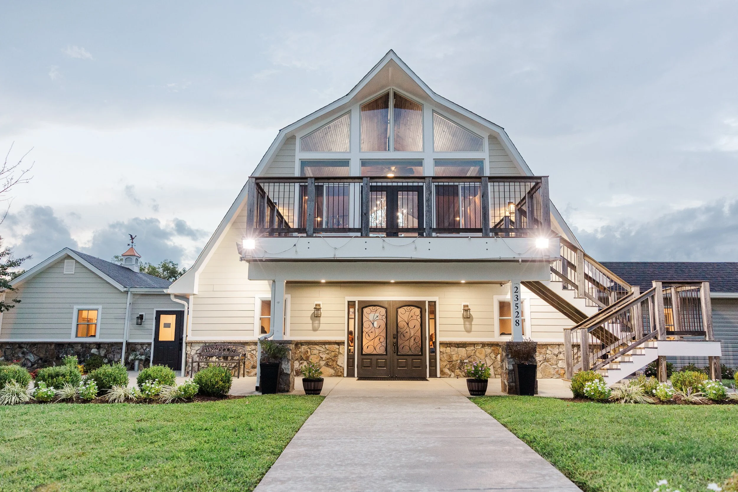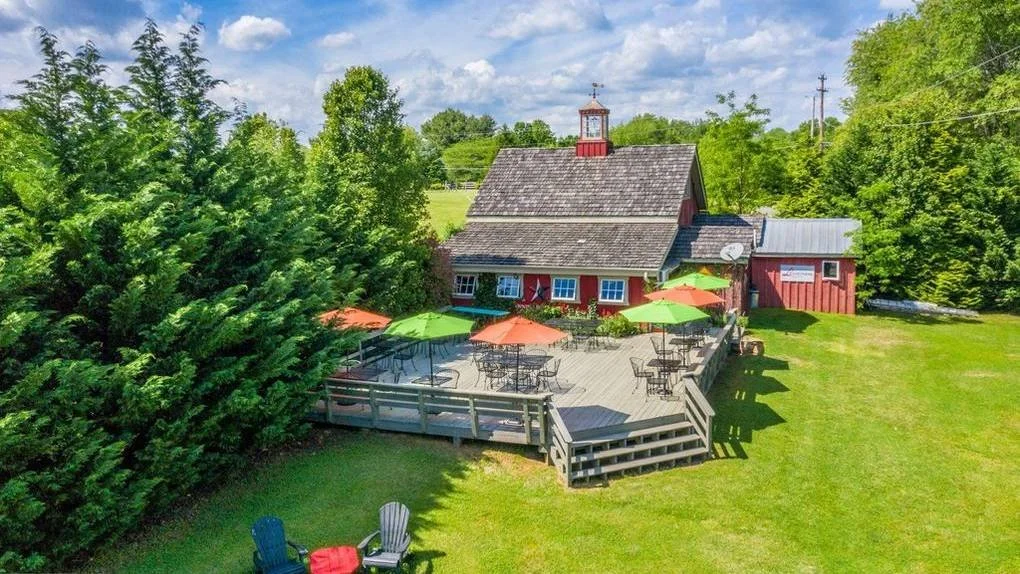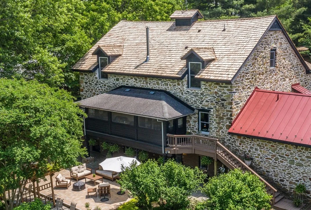 Sunroom with lots of light and adjoining outdoor patio covered by tent lined with cafe lights at the end of W&OD trail